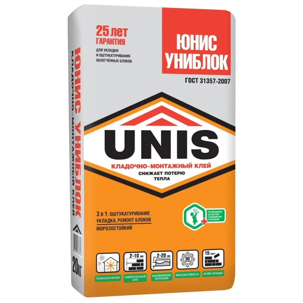 Клей кладочно-монтажный Unis Униблок рекомендуется для проведения кладочных (слоем 2-10 мм) и штукатурных работ (слоем 2-20 мм) как снаружи, так и внутри зданий и помещений с нормальной и повышенной влажностью. Для возведения стен и перегородок из облегчённых блоков на основе ячеистого бетона, пенобетона, газобетона, полистиролбетона, газосиликатных, силикатных и облегчённых керамических блоков, а также для заделки сколов, трещин, швов, выбоин глубиной до 40 мм.