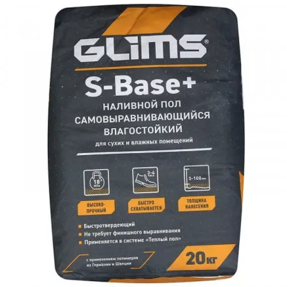 Glims S-Base+ – это влагостойкий наливной пол для первичного выравнивания в сухих помещениях и помещениях с умеренной влажностью. Смесь отлично растекается, разравнивается и не дает усадки. Создает ровное и прочное основание, на которое легко настилаются современные отделочные покрытия.