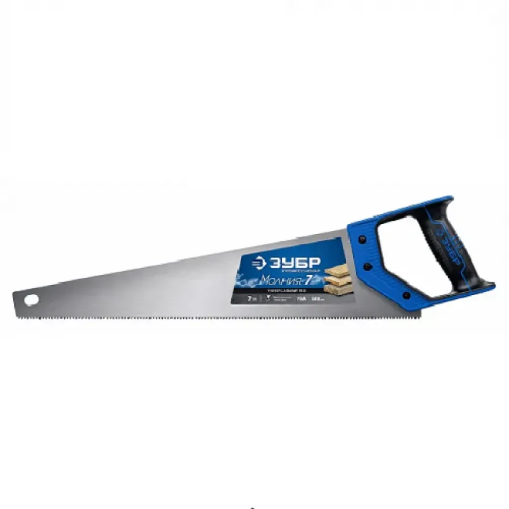 Ножовка универсальная Зубр Молния-7 500 мм 1537-50_z02, применяется для продольного и поперечного распила древесины, средних заготовок, фанеры, ДСП, МДФ. Двухкомпонентная эргономичная рукоятка. Импульсная закалка каждого зуба: высокая твердость и предотвращение выкрашивания. Утолщенное полотно из высококачественной стали У8А для идеально прямого реза. Зубья ножовки 2D.