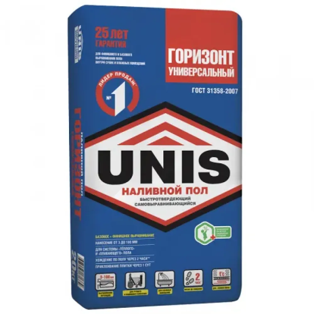 Наливной пол Unis Горизонт Универсальный предназначен для ручного и машинного выравнивания бетонных полов, цементных стяжек, на несущих основаниях со значительными (до 100 мм) неровностями, для получения прочной и идеально гладкой поверхности, а также для тонкослойного выравнивания (от 2 мм) оснований, имеющих незначительные неровности под последующую отделку декоративными покрытиями.
