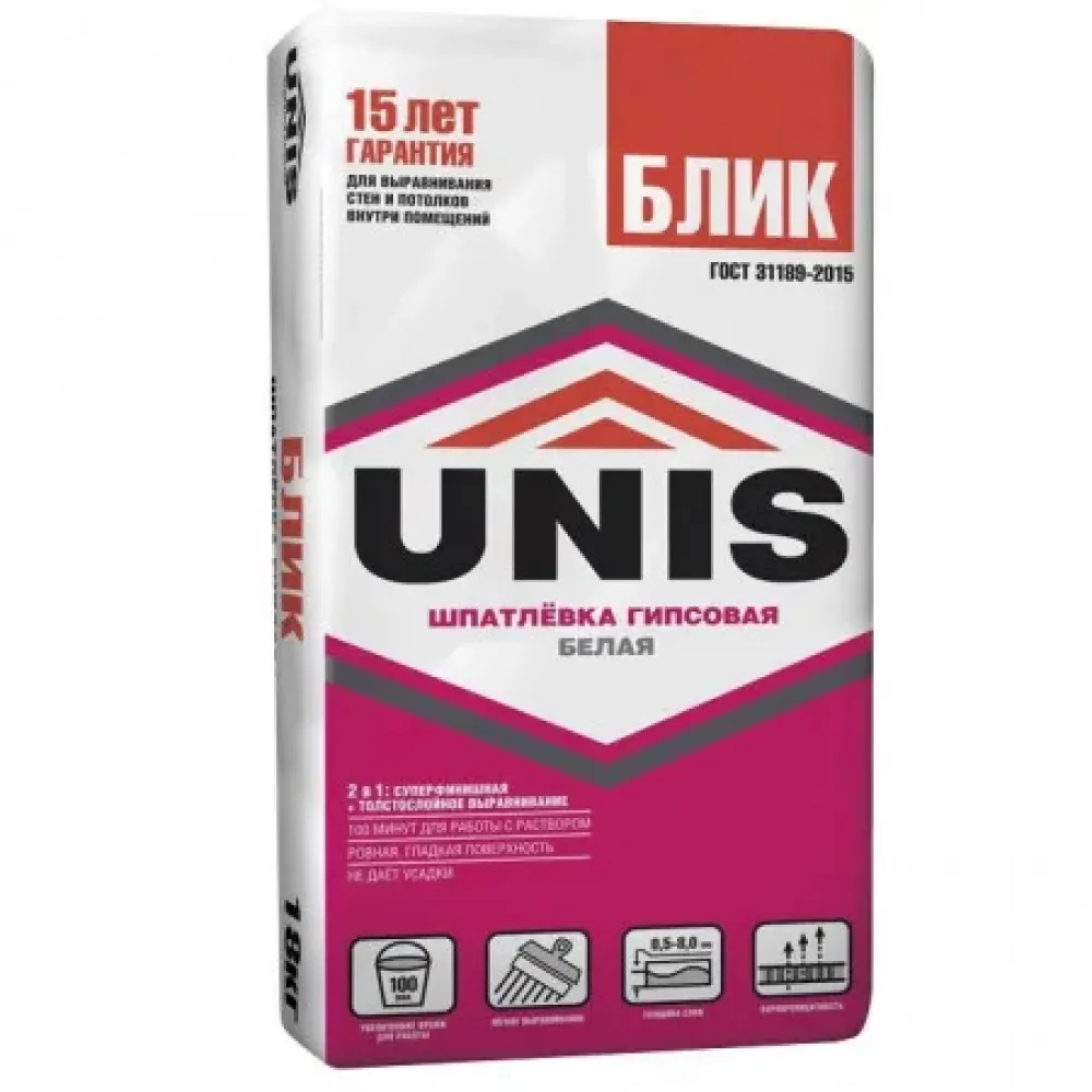 Шпатлевка Unis Блик на основе природных материалов для толстослойного финишного выравнивания поверхностей стен и потолков под последующую декоративную отделку; заделки неглубоких выбоин, трещин, раковин слоем до 8 мм, швов ГКЛ, ГВЛ с использованием армирующей ленты.