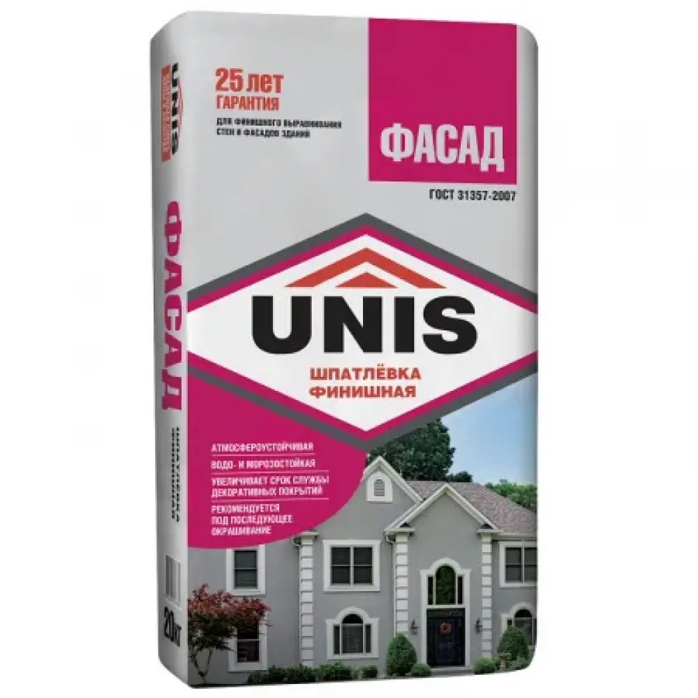 Шпатлевка цементная Unis Фасад серая предназначена для финишного выравнивания поверхностей фасадов зданий, заделки выбоин, трещин, раковин слоем до 6 мм под последующую отделку декоративными покрытиями. Применяется для наружных и внутренних работ, внутри сухих, влажных или неотапливаемых помещений.