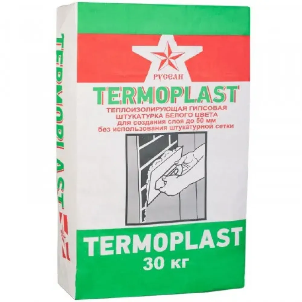 Штукатурка Русеан Термопласт – гипсовая штукатурка белого цвета на основе гипсового вяжущего, легкого наполнителя с применением минеральных и химических добавок. Используется для выравнивания поверхностей стен и потолков под оклейку обоями, окраску, облицовку керамической плиткой внутри жилых и общественных зданий с умеренной влажностью воздуха.