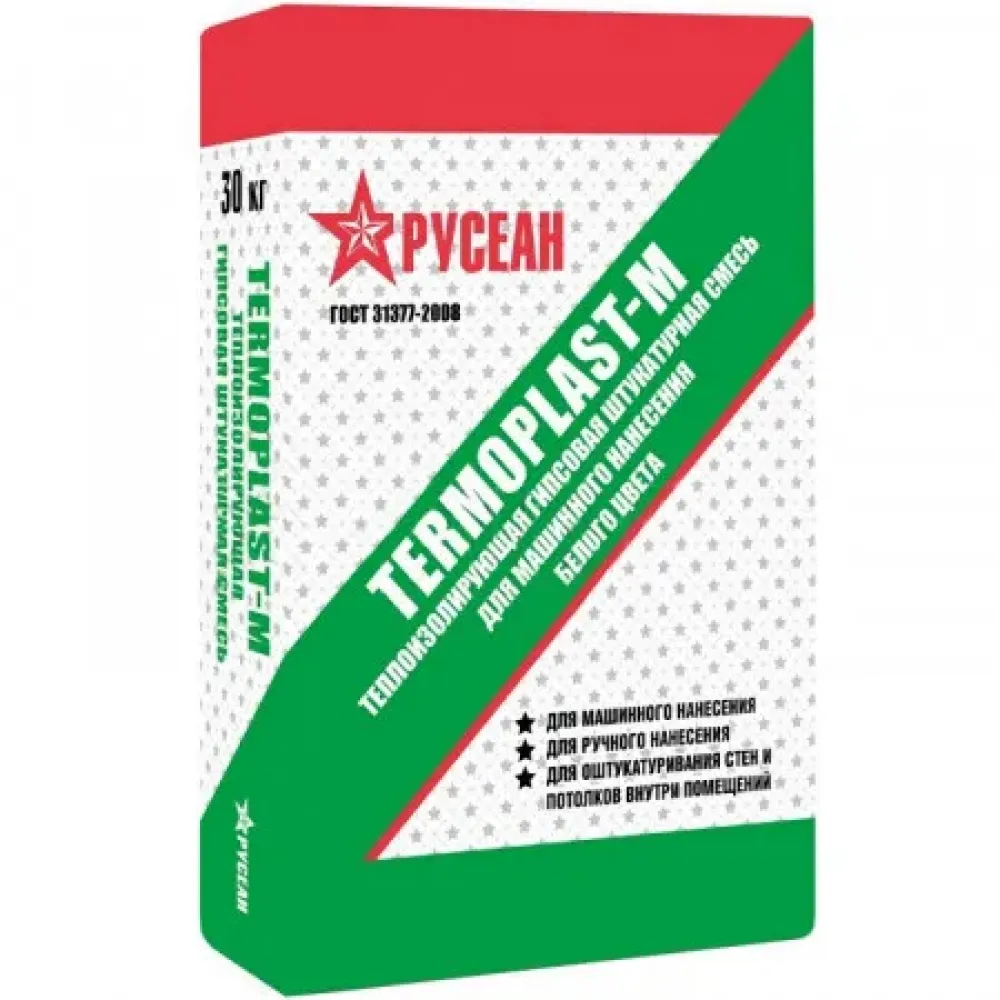 Гипсовая штукатурка Термопласт-M белого цвета на основе гипсового вяжущего, легкого наполнителя с применением минеральных и химических добавок. Применяется для выравнивания поверхностей стен и потолков внутри жилых и общественных зданий с умеренной влажностью под оклейку обоями, окраску, облицовку керамической плиткой.