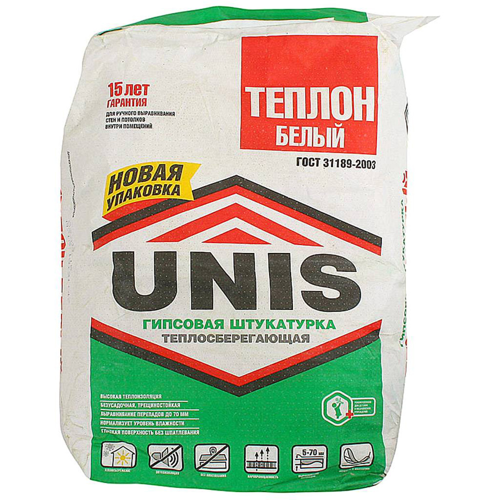 Штукатурка гипсовая теплосберегающая Unis Теплон Белый не просто греет, но и создает комфортный микроклимат в помещении. В состав штукатурки входит уникальная добавка на основе природного минерала - "перлит". Эта добавка существенно облегчает смесь и придает ей передовые теплосберегающие свойства. За счет своей легкости штукатурка существенно снижает нагрузку на основание и позволяет устранять даже глубокие неровности.