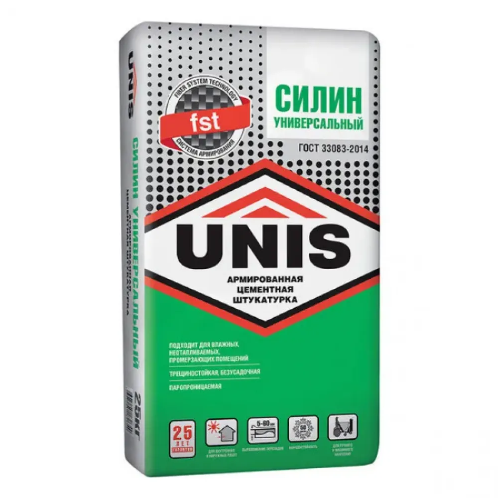 Цементная штукатурка Unis Силин армированная предназначена для выравнивания фасадов, применения внутри помещений при оштукатуривании стен и потолков слоем до 30 мм (без штукатурной сетки), для ремонта сколов, выбоин, раковин, трещин глубиной до 60 мм, заполнения стыков ЖБИ.