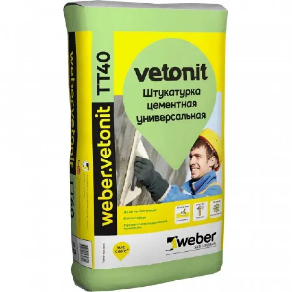 Штукатурка цементная универсальная Weber.Vetonit TT 40 подходит для базового выравнивания стен и потолков в сухих, влажных и мокрых помещениях перед облицовкой плиткой и природным камнем, нанесением декоративной штукатурки и финишным шпаклеванием.Применяется для выравнивания наружных поверхнотей зданий при проведении строительных и ремонтных работ