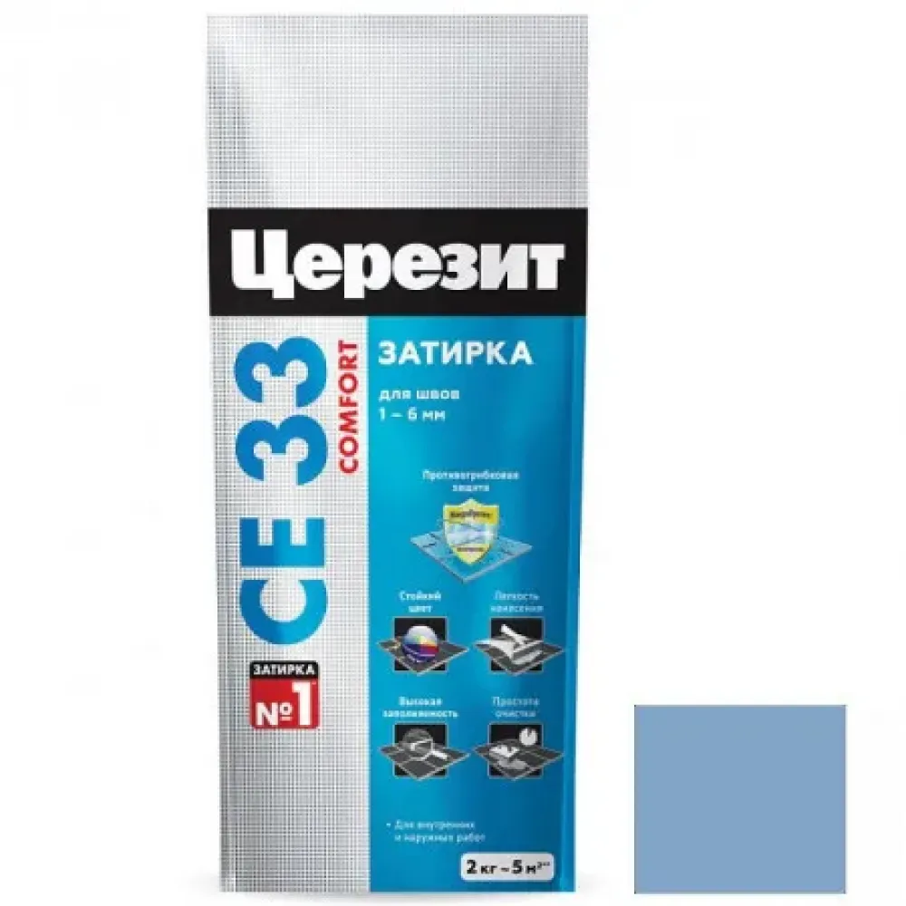 Затирка цементная Ceresit СЕ33 Comfort серо-голубая - затирка с противогрибковым эффектом для швов плиточных облицовок шириной до 6 мм. Предназначена для заполнения швов керамических и каменных облицовок, устроенных на недеформирующихся основаниях (таких как бетон, цементные стяжки и штукатурки), на полах и стенах внутри и снаружи зданий. Может применяться в небольших крытых бассейнах.